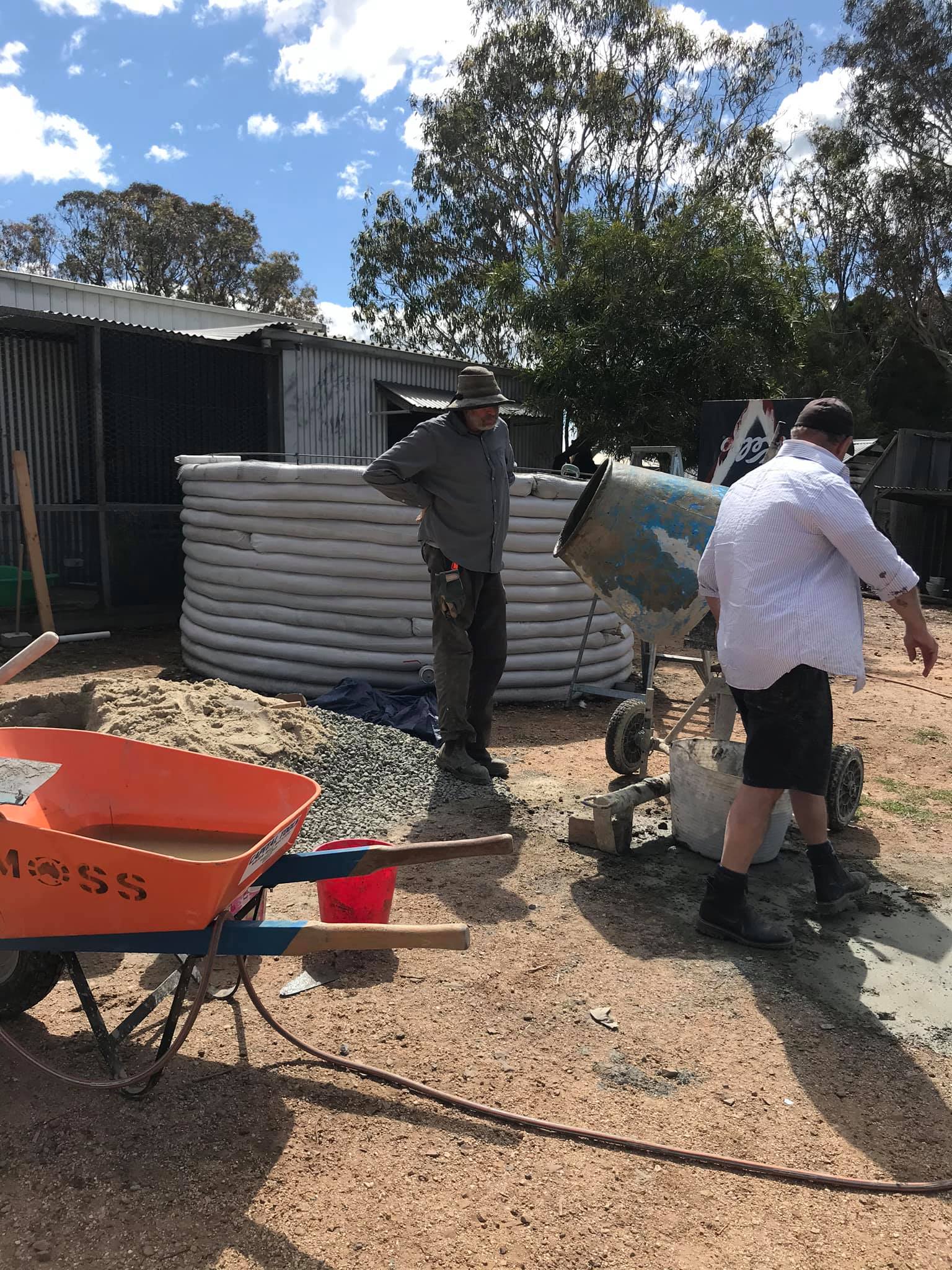 Helen Schloss: I already had an understanding of the sustainability and affordability of earthbag building. I was interested in building a second home from earthbags on our property. Then we experienced the bushfires from early December 2019 and January 2020. I was gobsmacked by the melted tanks I saw on telly. People lost their homes and there has been a long waiting time for them to receive assistance, especially the wait to get a roof over their heads. I was concerned by the need for water, and I thought, surely if you can build a house out of earthbags, you can make a water tank using the same methods.  So I put a few words into Google, and one of the first things I found was the Vanuatu Earthbag Facebook page. That was early February this year. I saw a post that Liz Sherborne had written saying they had been using earthbag-building methods in Vanuatu. She noted that earthbag water tanks would be a valuable resource in fire-prone areas of Australia.  Helpful in protecting people’s properties, their lives and the lives of animals. I wrote a comment asking if they would be interested in doing a workshop down our way at some point. She instantly messaged me, and the project evolved from there. Liz said that if we could find ten people to assist with the building, they would come to Bywong. In some ways, it was serendipity.